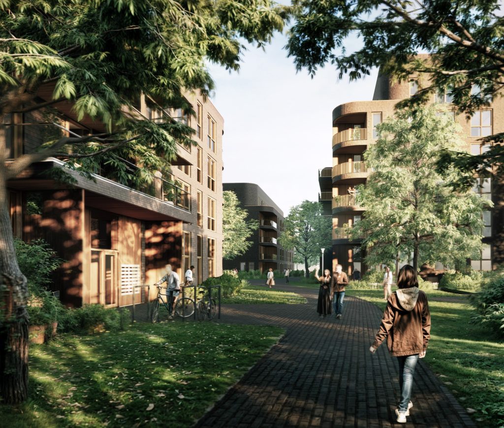 Te midden van een groene, landgoedachtige omgeving zijn vier appartementengebouwen ontworpen met een sterke focus op duurzaamheid. De rijke cultuurhistorie van de plek vroeg om een ontwerp dat respectvol in de omgeving zou passen, maar toch een eigentijdse uitstraling kreeg. Daarom is gekozen voor circulair en demontabel materiaalgebruik – modern, maar versterkend voor de historische waarde. Deze keuze bracht ook uitdagingen met zich mee. Vooral de hoekaansluitingen van de keramische gevelelementen vroegen om inventiviteit. Door de hoeken rond te maken, konden de gevels naadloos in elkaar overvloeien. Zo werd een technische uitdaging omgezet in een ontwerpkwaliteit, waarbij de kracht van circulair materiaal volledig tot zijn recht komt.